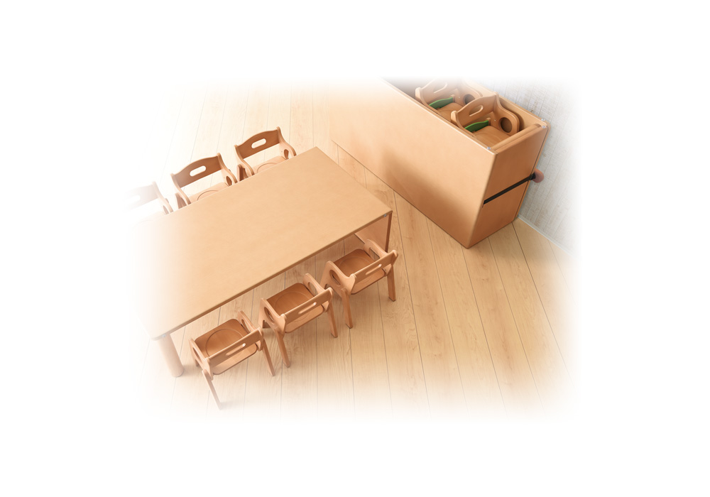安心の収納 固定器具と組み合わせて収納した机と椅子は、東日本大震災の様な大きな地震で起きても飛び散ることがなく、園児を家具による危険に晒す事無いように配慮しました。