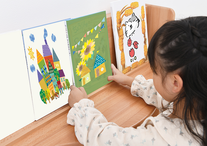 表紙が見える面出しタイプ。園児の目線で本を選んで手に取りやすい構造。